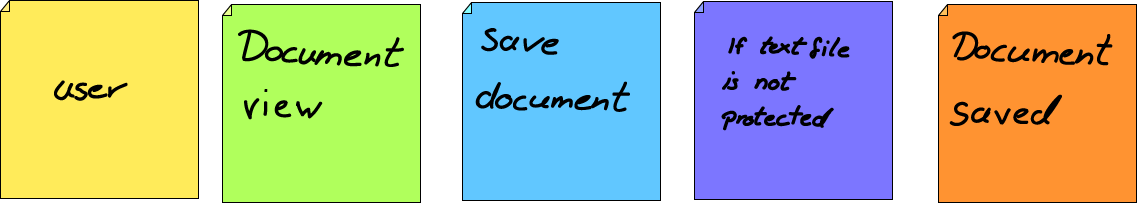 In this first phase, external systems can also appear. For example, if you want to save the text document not to the disk but to an online storage, which is not part of your system, it is written on a pink sticky note. You also include relevant events that are passed from the external system to your system, like "File was locked by another user."
